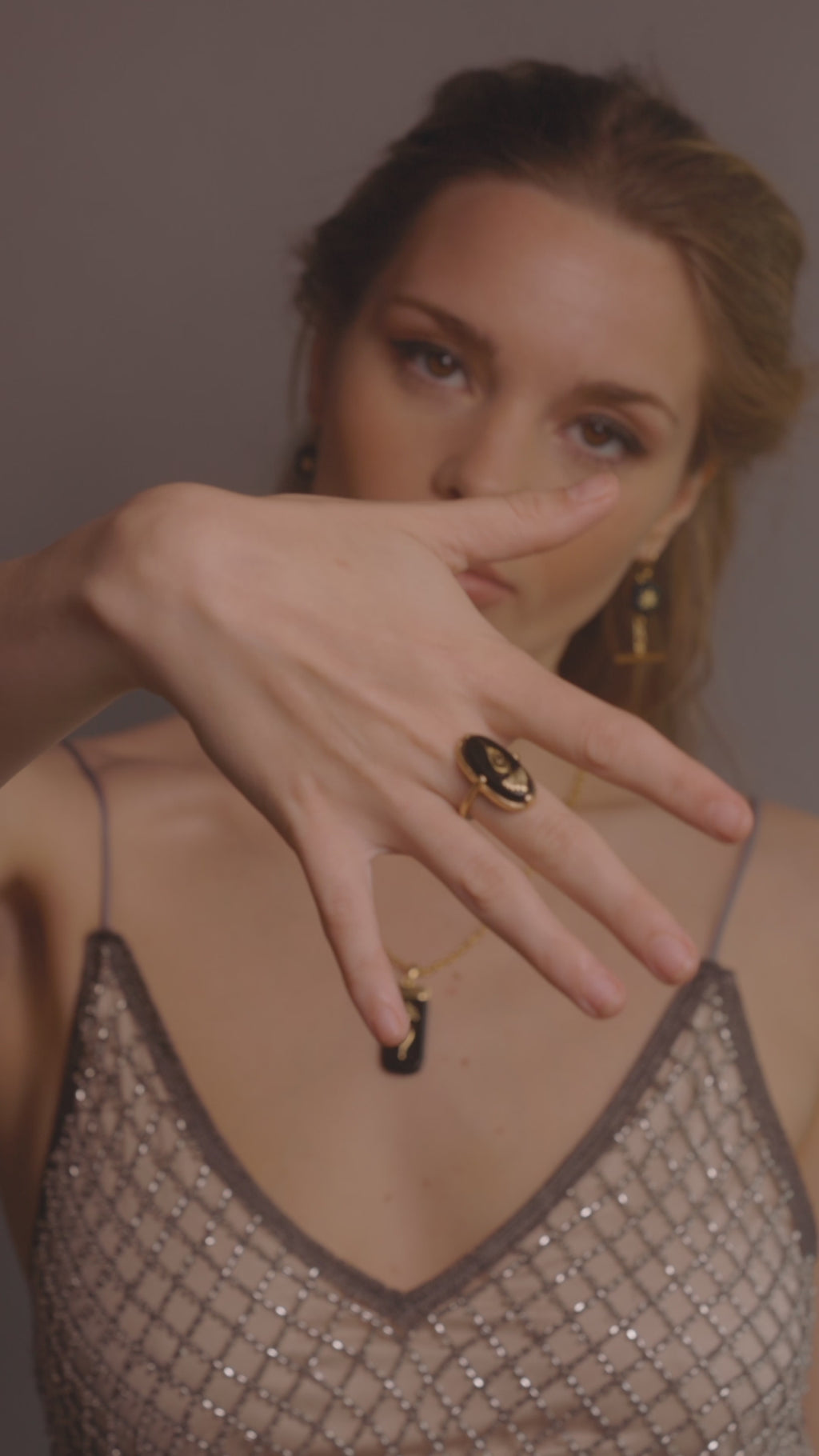 Feminine and masculine elements are entwined in these cufflink earrings inspired by Victorian mourning jewellery of the 1800s. Crafted on a master stone of solid onyx crystal bevelled with a sophisticated gold vermeil star and white pearl inlays.