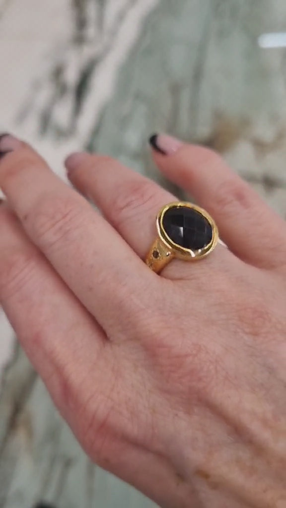 Sleek, minimalist, and effortlessly glamorous — this onyx ring from the MODA collection channels 1960s Jet Set sophistication with a fresh, modern twist. Smooth oval onyx paired with a small smokey quartz and white topaz at the sides creating a refined statement that’s timeless yet totally now.