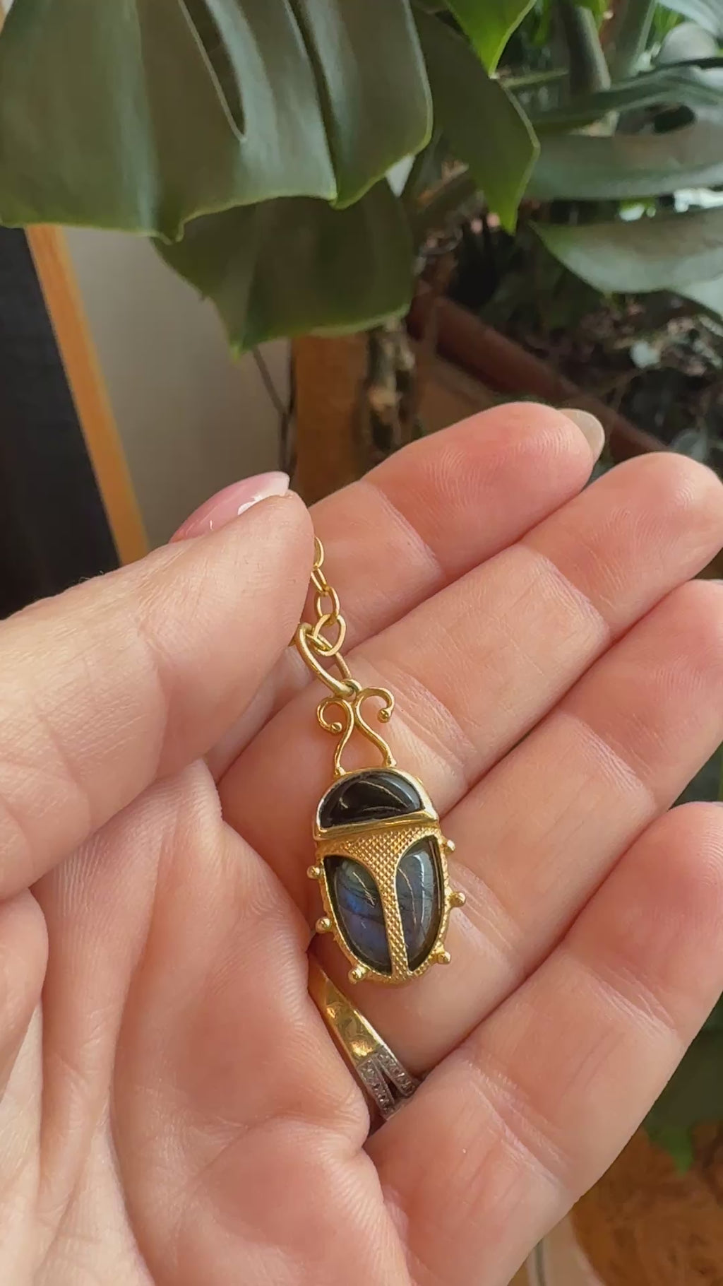 A powerful symbol of protection and renewal, this labradorite or onyx scarab amulet is designed as a modern talisman. Inspired by ancient Egyptian symbolism, the scarab represents transformation, strength and guidance. Labradorite encourages intuition and inner vision, while onyx offers grounding and resilience. Wear it clipped onto our Cathy Pope chains or paired with a simple chain — alone or layered, intentional, timeless and empowering.